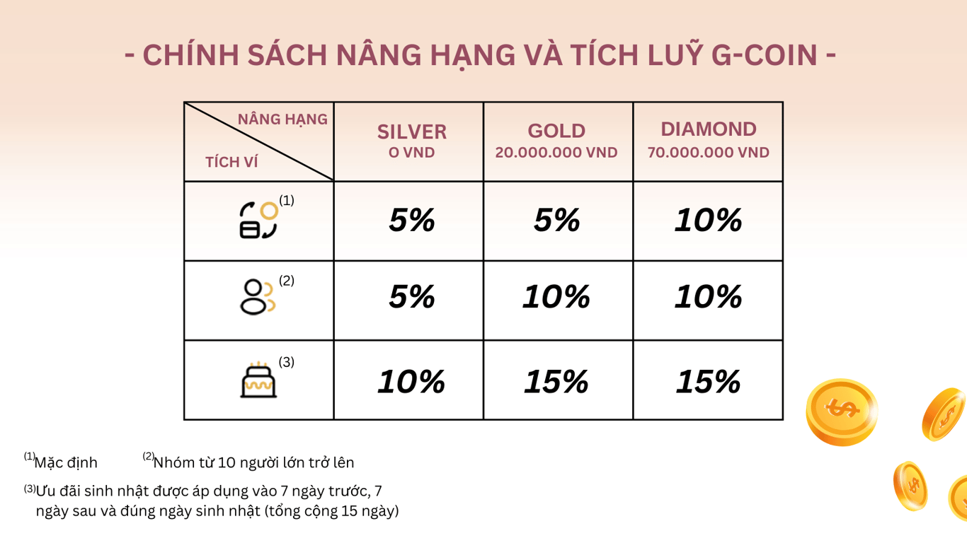Sau khi sử dụng coupon có trên ứng dụng, khách hàng thành viên vẫn được tích lũy nâng hạng và tích lũy G-coin (tích ví) tính trên số tiền khách hàng thực trả trước VAT sau khi giảm trừ coupon/voucher.